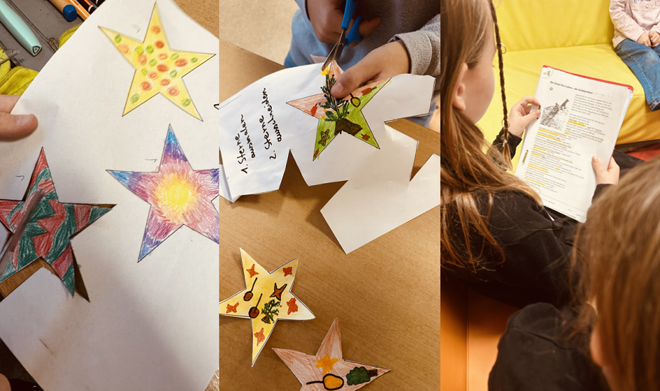 Es wurden Sterne für den Weihnachtsbaum gebastelt. Anschließend haben die älteren Kinder den Erstklässlern eine Weihnachtsgeschichte vorgelesen.