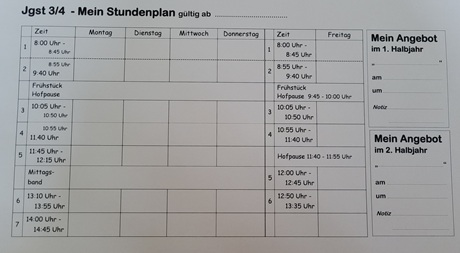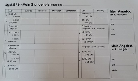 Tagesablaufin Folge des verlässlichen Halbtagbetriebs hat sich der Tagesablauf geändert. Hier können Sie die Zeiten des Tagesablaufes sehen und sich unten diese Übersichten auch herunterladen. Jgst 3/4 - Mein Stundenplan Jgst 5/6 - Mein Stundenplan